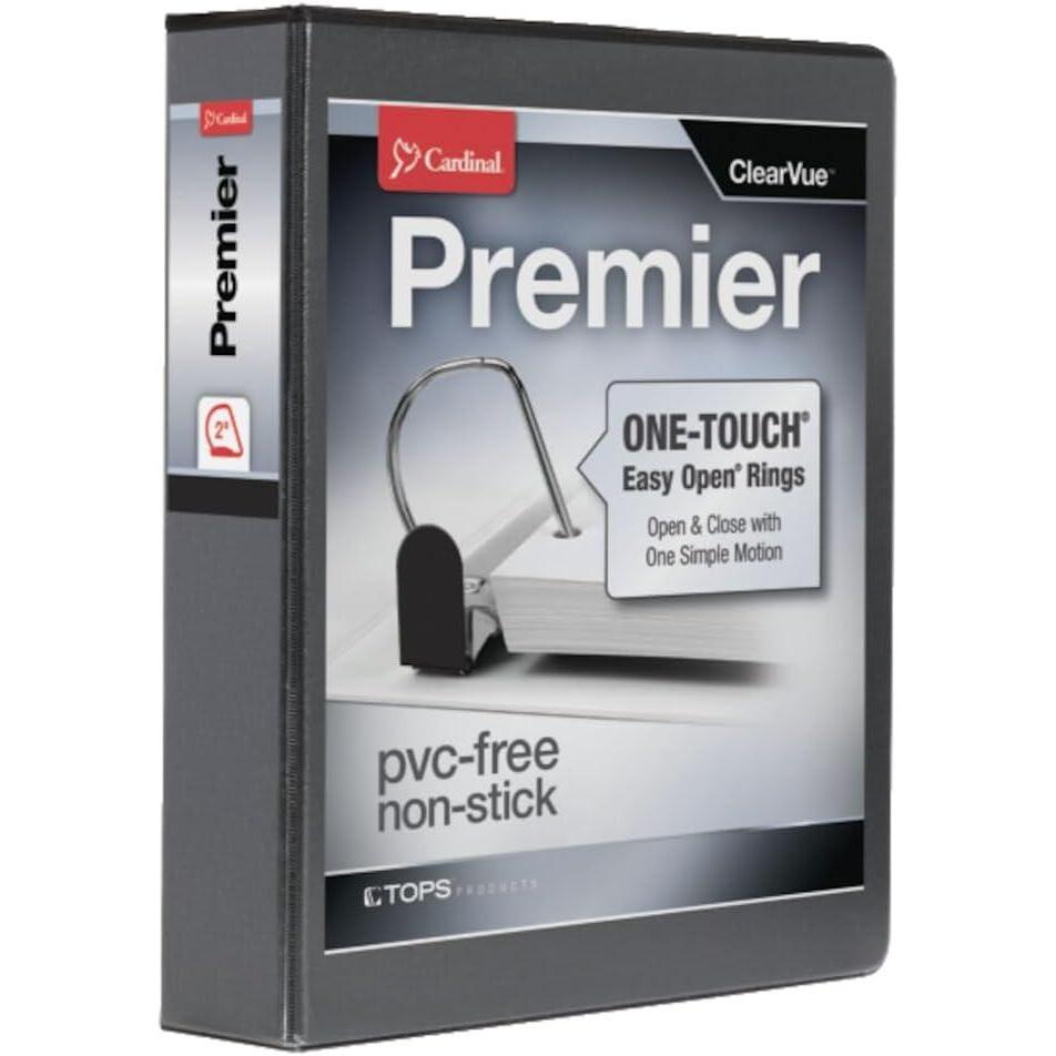 Cardinal Premier binders make stunning presentations and are a durable, easy-to-use option over the basic 3-ring binder. These Premier 2-inch binders have Slant-D rings that hold more paper than your standard round ring binder—up to 565 sheets each. ClearVue binder covers let you personalize your notebook on all 3 sides, front, back and spine. Inserts slip easily behind glare-free overlays so your message shines through and is easy to replace. Our Easy Open ONE-TOUCH rings open, close and lock with one simple motion. Whether you’re loading and reorganizing one binder for school or a dozen for presentations, Premier binders save you considerable time and effort. Look for this ergonomic, no-pinch upgrade over the standard binders on your home office or school supplies list. Every Cardinal binder is reinforced to last with XtraLife cover hinges that resist tearing or splitting at the seams from normal daily use. Covers are made of non-stick material that resists ink and toner transfer for clean, smudge-free covers. Binders are archival-safe for documents and photos. Four clear interior binder pockets make a neat place to tuck handouts, small papers or unpunched work. Add binder dividers for total 3 ring binder organization. 2inch Binder. 565-Sheet capacity. Black.