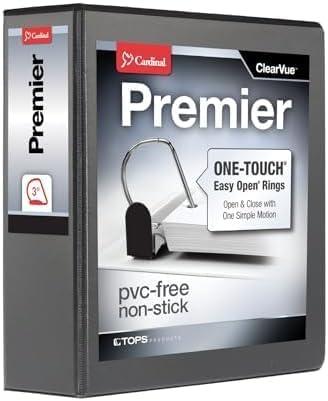 Cardinal Premier binders make stunning presentations and are a durable, easy-to-use option over the basic 3-ring binder. These Premier 3-inch binders have Slant-D rings that hold more paper than your standard round ring binder—up to 650 sheets each. ClearVue binder covers let you personalize your notebook on all 3 sides, front, back and spine. Inserts slip easily behind glare-free overlays so your message shines through and is easy to replace. Our Easy Open ONE-TOUCH rings open and close with one simple motion. Whether you’re loading and reorganizing one binder for school or a dozen for presentations, Premier binders save you considerable time and effort. Look for this ergonomic, no-pinch upgrade over the standard binders on your home office or school supplies list. Every Cardinal binder is reinforced to last with XtraLife cover hinges that resist tearing or splitting at the seams from normal daily use. Covers are made of non-stick material that resists ink and toner transfer for clean, smudge-free covers. Binders are archival-safe for documents and photos. Four clear interior binder pockets make an ideal place to tuck handouts, small papers or unpunched work. Add binder dividers for total 3 ring binder organization. 3-inch Binder. 650-Sheet capacity. Black.