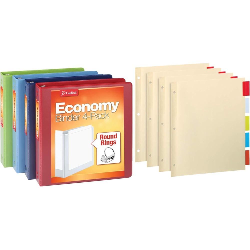 These Cardinal Economy Pack Binders have everything you need to keep papers in place and organized. They come with four 3-ring binders in pleasant fashion colors and 4 sets of 5 tab binder dividers, so you'll always know right where your work is. ClearVue presentation binders have a customizable front, back and spine, making labeling and relabeling your binder a breeze. The XtraLife hinges help resist tearing along cover seams, ensuring your binders are durable and free from rips. The non-stick material sees to it that ink and toner don't bleed or transfer, ensuring that your covers are clean and smudge-free. Each binder has two clear interior pockets for storing extra paper and assignments. The 5-Tab binder dividers have multicolor binder tabs with customizable inserts. Simply label your inserts, and never lose sight of where your projects are. 1.5-inch Binders hold 350 sheets of paper. 4 Pack comes in assorted colors: blue, red, light blue and green.