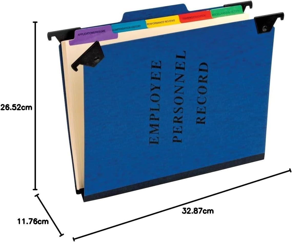 Classification folders with pivoting hangers feature a 1/3 cut tab in middle position for employee”s name. Five Mylar-reinforced tab dividers within folder: Application/Resume, Compensation, Performance, Training/Education, Misc. Each offers 1″ bonded fastener and 20 point PressGuard covers, specially coated to resist moisture. The 2″ reinforced rip-proof tape gusset expansion offers space for a thick stack of documents. SFI Certified.