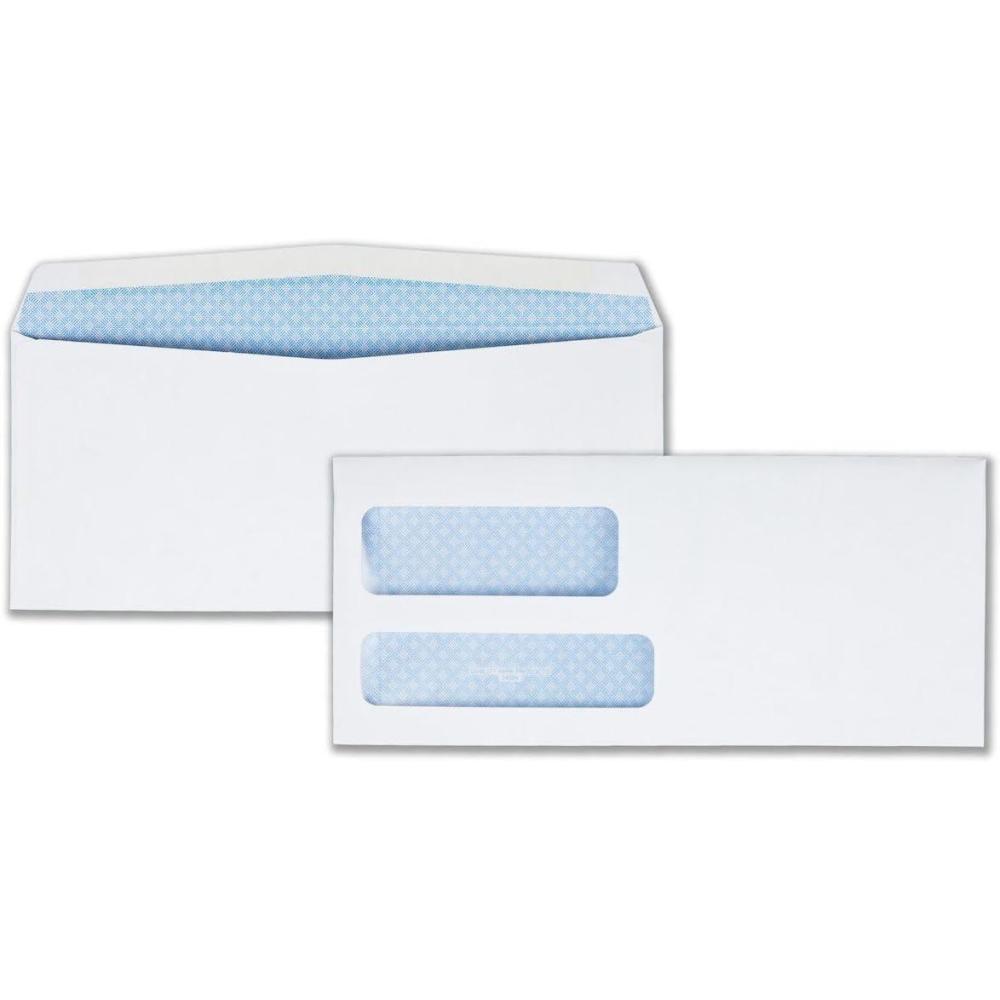 Quality Park #9 Double Window Envelopes show the sender address and receiver address for billing invoices, business checks and other important statements. These security envelopes have a reflex blue pattern to protect sensitive information, even when envelopes are held up to light. Each moisture sealed envelope is made of 24 lb white wove paper with side seams for a professional appearance. Business envelopes seal closed by simply adding moisture to the gummed, commercial flap. Available in boxes of 500 so you never run out! Envelope dimensions are 3 7/8 x 8 7/8 inches. Top window dimensions are 1 3/16 x 3 1/2 inches, 3/8 inches from the left and 2 inches from the bottom. Bottom window dimensions are 1 x 4 inches, 3/8 inch from the left and a 1/2 inch from the bottom.